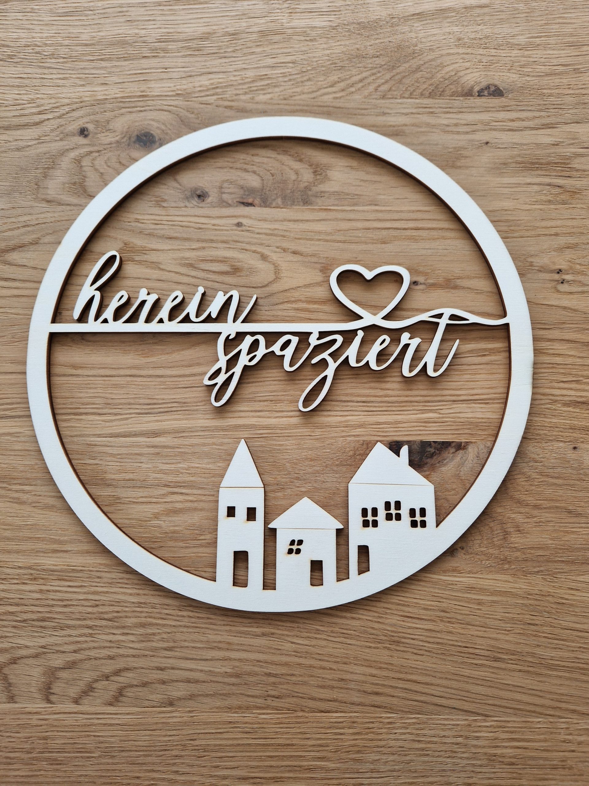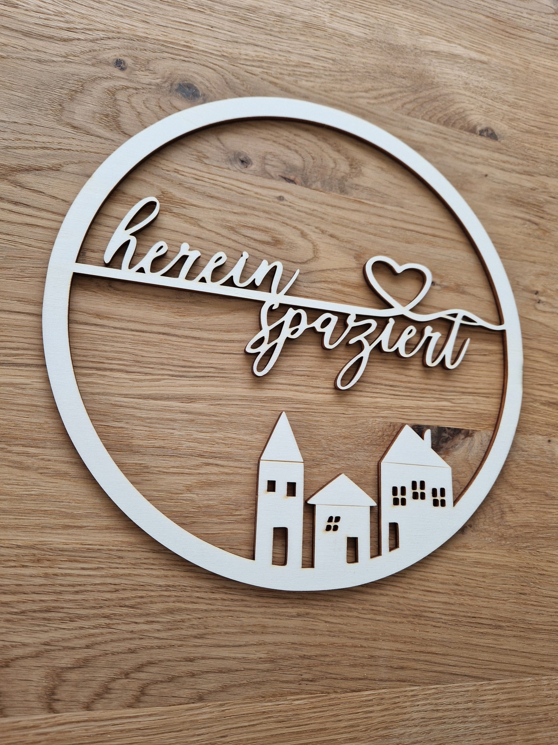 Das Hereinspaziert Kranz aus Holz ist das perfekte Blickfang für das Zuhause.